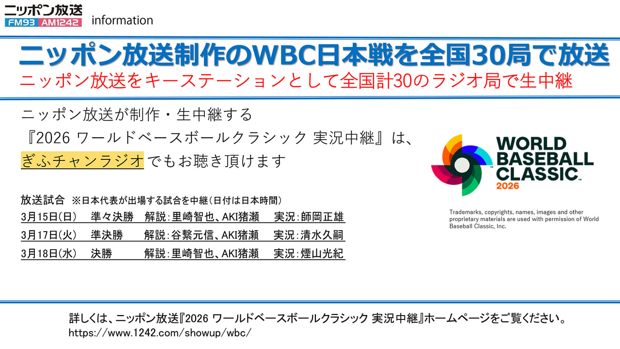 【テレビ】毎週抽選で1名様に5000円分のクオカードをQUOカードをプレゼント!応募には番組内で発表されるキーワードが必要です!番組をチェックして、専用応募フォームから応募してください!詳しくはこちら! 【テレビ】毎週抽選で1名様に5000円分のクオカードをQUOカードをプレゼント!応募には番組内で発表されるキーワードが必要で… テレビ・データ放送でじゃんけんゲームに挑戦しよう!第4弾は、飛騨牛商品券1万円分 を抽選で5名様にプレゼント!! キャンペーン開催期間は3月1日(日)~31日(火) テレビ・データ放送でじゃんけんゲームに挑戦しよう!第4弾は、飛騨牛商品券1万円分 を抽選で5名様にプレゼント!! キャンペー… 【ラジオ】3月29日(日)ひる1時30分~2時25分 【3月のゲスト】石田 仁(大垣市長)、5GAP(吉本興業)、長澤明日香(シンガソングライター)、澤田大樹(俳優)、やながせゆっこ 【ラジオ】3月29日(日)ひる1時30分~2時25分 【3月のゲスト】石田 仁(大垣市長)、5GAP(吉本興業)、長澤明日香… 社会福祉事業協賛 ワールド・ドリームサーカス大垣公演 2026年4月18日(土)~ 7月21日(火)開催 社会福祉事業協賛 ワールド・ドリームサーカス大垣公演 2026年4月18日(土)~ 7月21日(火)開催 【キャンペーン期間】2月24日(火)~3月19日(木) ラジオの魅力と「radiko」の便利さをご紹介し、ラジオのある豊かな生活をご提案します。くわしくはキャンペーンサイトへ! 【キャンペーン期間】2月24日(火)~3月19日(木) ラジオの魅力と「radiko」の便利さをご紹介し、ラジオのある豊かな… 2026年4月25日(土)開催 ~女性のためのマネーセミナー~\今すぐ知りたい新NISA/「すぐに使えるお金の貯め方と家計節約術」 2026年4月25日(土)開催 ~女性のためのマネーセミナー~\今すぐ知りたい新NISA/「すぐに使えるお金の貯め方と家計節… 市政テレビ番組「あなたの街から岐阜市」の視聴者アンケートを実施中です。ご回答いただいた方の中から、抽選でふるさと納税返礼品にもなっている岐阜市特産品をプレゼントします。 市政テレビ番組「あなたの街から岐阜市」の視聴者アンケートを実施中です。ご回答いただいた方の中から、抽選でふるさと納税返礼品に… 【3/27まで】めっちゃぎふわかるてれび 番組SNSキャンペーン開催中! 【3/27まで】めっちゃぎふわかるてれび 番組SNSキャンペーン開催中! 2026ぎふチャン公式テーマソングにシンガーソングライター長澤明日香さんの「あなたとGIFT」とし、テレビ・ラジオ・SNSなどで展開いたします!詳しくはこちら! 2026ぎふチャン公式テーマソングにシンガーソングライター長澤明日香さんの「あなたとGIFT」とし、テレビ・ラジオ・SNSな… 新着情報 テレビ 1月 5日(月) テレビ・タイムテーブル 2026年1~3月版はこちらから ラジオ 1月 5日(月) ラジオ・タイムテーブル 2026年1~3月版はこちらから お知らせ12月 6日(金) “あなた”のドキュメンタリー、作りませんか? その他 9月17日(火) タイムテーブルの郵送をご希望の方へ ニュース “昭和レトロ風”啓発チラシ SNS型詐欺被害防止 岐阜北署若手署員がデザイン考案 3月11日 20:32 SNS型投資詐欺で1億円超被害 岐阜市の60代男性 金の延べ棒などだましとられる 3月11日 19:58 「あの日を忘れない」岐阜県民も鎮魂の祈りや教訓の決意 東日本大震災から15年 3月11日 18:23 岐阜県議会 江崎知事が防災対策で答弁 自治会強化、災害に強い道路網推進へ 3月11日 17:30 地元酒造会社と商品化「土岐商サイダー」 岐阜・土岐商高生がCFで販路拡大へ 3月11日 17:00 一覧を見る テレビ新着 煌く岐阜 次回予告2026年3月16日(月) よる… ぎふ県政ほっとライン 次回予告2026年3月12日(木)【再放… ぎふ県政ほっとライン 2026年3月放送3月5日(木)【再放送… ぎふ県だより 2026年3月6日(金)放送「働いてもら… 一覧を見る ラジオ新着 週刊ぎふタイム 次回予告3月18日キャリ☆ナビ 番組概… Music Tune(ミュージック・チューン) きょうのテーマ3月12日(木)のメッセー… きょうもラジオは!? 2時6時 メッセージテーマ3月12日(木)「 駄菓… ドクター教えて! ~お医者さんの本音~ 次回予告3月16日 テーマ「転移しても“… 一覧を見る ブログ新着 キッズアカデミー✨聞いてね😊 藤村 恵理 「おしえてぎふチャンラジオ!キッズアカデ… 13日のめっちゃぎふ🦐愛知の情報も🌸 東 千晴 春ですね~ 花粉症の私は大変なのですが…… 今が旬「真牡蠣」 永田 楓 御嵩町のラスパ御嵩では、今が旬の真牡蠣を… 牧謙次郎さんご出演♪ 小沢 典子 3月4日(水)の「小沢典子のたっぷりモー… 一覧を見る @gifuchan Tweets by gifuchan