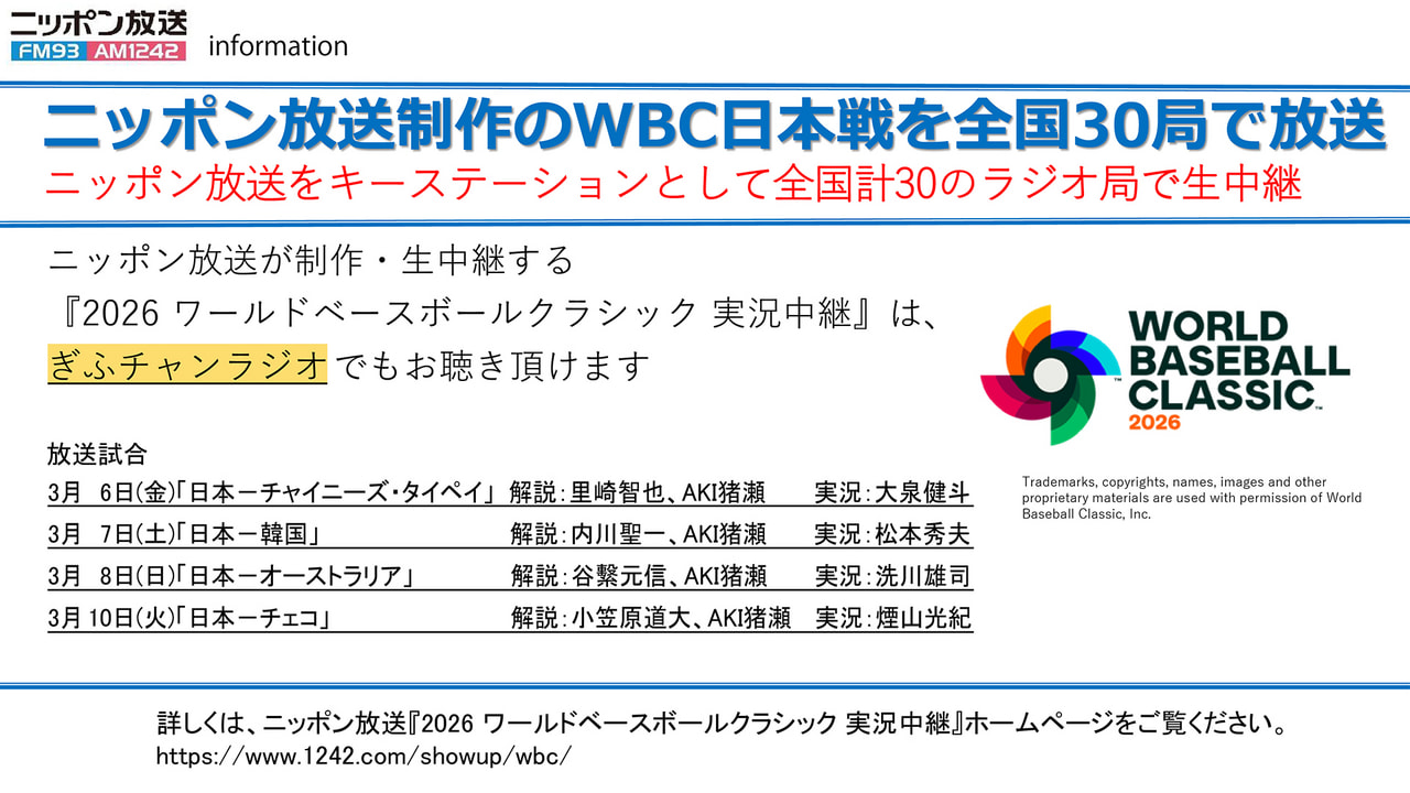 ニッポン放送制作のWBC日本戦を全国30局で放送 ニッポン放送をキーステーションとして全国計30のラジオ局で生中継 ニッポン放送制作のWBC日本戦を全国30局で放送 ニッポン放送をキーステーションとして全国計30のラジオ局で生中継 【ラジオ】3月29日(日)ひる1時30分~2時25分 【3月のゲスト】石田 仁(大垣市長)、5GAP(吉本興業)、長澤明日香(シンガソングライター)、澤田大樹(俳優)、やながせゆっこ 【ラジオ】3月29日(日)ひる1時30分~2時25分 【3月のゲスト】石田 仁(大垣市長)、5GAP(吉本興業)、長澤明日香… 社会福祉事業協賛 ワールド・ドリームサーカス大垣公演 2026年4月18日(土)~ 7月21日(火)開催 社会福祉事業協賛 ワールド・ドリームサーカス大垣公演 2026年4月18日(土)~ 7月21日(火)開催 【キャンペーン期間】2月24日(火)~3月19日(木) ラジオの魅力と「radiko」の便利さをご紹介し、ラジオのある豊かな生活をご提案します。くわしくはキャンペーンサイトへ! 【キャンペーン期間】2月24日(火)~3月19日(木) ラジオの魅力と「radiko」の便利さをご紹介し、ラジオのある豊かな… 2026年4月25日(土)開催 ~女性のためのマネーセミナー~\今すぐ知りたい新NISA/「すぐに使えるお金の貯め方と家計節約術」 2026年4月25日(土)開催 ~女性のためのマネーセミナー~\今すぐ知りたい新NISA/「すぐに使えるお金の貯め方と家計節… 【テレビ】毎週抽選で1名様に5000円分のクオカードをQUOカードをプレゼント!応募には番組内で発表されるキーワードが必要です!番組をチェックして、専用応募フォームから応募してください!詳しくはこちら! 【テレビ】毎週抽選で1名様に5000円分のクオカードをQUOカードをプレゼント!応募には番組内で発表されるキーワードが必要で… 市政テレビ番組「あなたの街から岐阜市」の視聴者アンケートを実施中です。ご回答いただいた方の中から、抽選でふるさと納税返礼品にもなっている岐阜市特産品をプレゼントします。 市政テレビ番組「あなたの街から岐阜市」の視聴者アンケートを実施中です。ご回答いただいた方の中から、抽選でふるさと納税返礼品に… 【3/27まで】めっちゃぎふわかるてれび 番組SNSキャンペーン開催中! 【3/27まで】めっちゃぎふわかるてれび 番組SNSキャンペーン開催中! 2026ぎふチャン公式テーマソングにシンガーソングライター長澤明日香さんの「あなたとGIFT」とし、テレビ・ラジオ・SNSなどで展開いたします!詳しくはこちら! 2026ぎふチャン公式テーマソングにシンガーソングライター長澤明日香さんの「あなたとGIFT」とし、テレビ・ラジオ・SNSな… 新着情報 ラジオ 2月 2日(月) ニッポン放送制作のWBCラジオ中継 計30のラジオ局で「全国生中継」が決定!『2026 ワールドベースボールクラシック 実況中継』詳細はこちら テレビ 1月 5日(月) テレビ・タイムテーブル 2026年1~3月版はこちらから ラジオ 1月 5日(月) ラジオ・タイムテーブル 2026年1~3月版はこちらから お知らせ12月 6日(金) “あなた”のドキュメンタリー、作りませんか? その他 9月17日(火) タイムテーブルの郵送をご希望の方へ ニュース 岐阜県議会開会 新年度予算案など68議案を上程 江崎知事「未来を切り拓く力強い岐阜県を目指す」 2月26日 17:30 40日ぶり城山公園開放 春の妖精「セリバオウレン」 岐阜県高山市 2月26日 17:00 子どもたちの夢を応援 『蜂蜜★皇帝』が岐阜特別支援学校でライブ 2月26日 17:00 ものづくりの研究成果を発表 東海職業能力開発大学校 岐阜県大野町 2月26日 17:00 山林火災を想定 岐阜市の金華山で消防訓練 大船渡の大規模火災の教訓も 2月26日 16:21 一覧を見る テレビ新着 岐阜県公立高等学校入学者選抜 解答速報 ~第一次選抜~ 番組概要3月4日に行われる岐阜県公立高校… 岐阜の名景 次回予告2026年3月4日(水)よる9時… めっちゃぎふわかるてれび <2・3月はキーワードプレゼント月間!>… ぎふ県だより 2026年2月20日(金)放送防犯アプリ… 一覧を見る ラジオ新着 きょうもラジオは!? 2時6時 メッセージテーマ2月27日(金)「マヨネ… Music Tune(ミュージック・チューン) きょうのテーマ2月27日(金)のメッセー… ひなたみなの演歌恋々 次回予告2月28日 ゲスト:堀典仁さん(… ドクター教えて! ~お医者さんの本音~ 次回予告3月2日 テーマ「がんの痛み~放… 一覧を見る ブログ新着 アートで心も明るく💡 東 千晴 名鉄岐阜駅近くにある新岐阜地下道加納高校… 防災について考える 小沢 典子 2月18日(水)の「小沢典子のたっぷりモ… バレンタイン💕店長のおすすめは・・・ 東 千晴 今日はバレンタインデー✨13日のめっちゃ… スティックチョコレート🍫 小沢 典子 2月11日(水)の「小沢典子のたっぷりモ… 一覧を見る @gifuchan Tweets by gifuchan