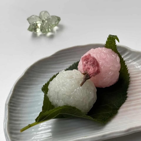 舟に見立てた青葉に、ひと口サイズの桜もちが二つ並んでいます。