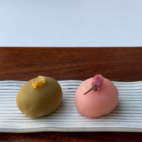 生道明寺風に仕込み、桜あんと抹茶餡が包まれています。