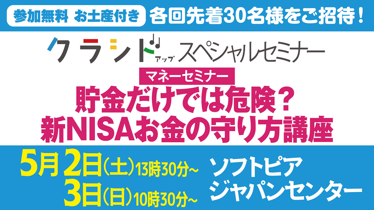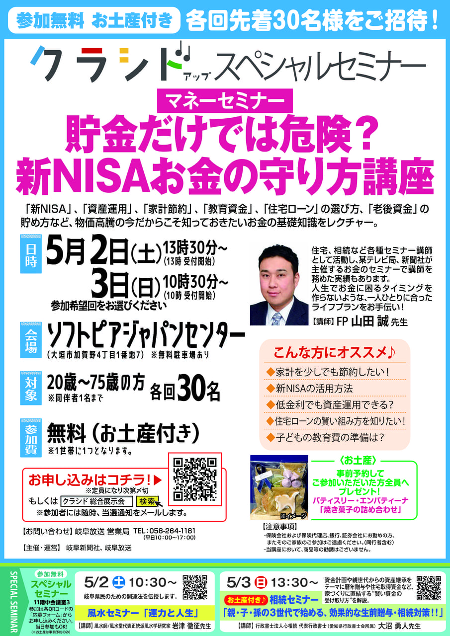 イベント イベント クラシドスペシャルセミナー クラシドスペシャルセミナー イベント概要 マネーセミナー申し込み 風水セミナー申し込み 相続セミナー申し込み そのほかのイベント 子どもの日 キッズパーティー in モレラ岐阜 地域と歩み、地域を支える薬剤師。岐阜から発信、未来を創る。 第二回ぎふ薬学フォ-ラム2026 2026年5月10日(日)開催 応募は締め切りました データ放送じゃんけんプレゼントキャンペーン 2025年度 第4弾 飛騨牛商品券1万円分 を抽選で5名様にプレゼント! 募集 ~女性のためのマネーセミナー~\今すぐ知りたい新NISA/「すぐに使えるお金の貯め方と家計節約術」 2026年4月25日(土)開催 「イベント」トップへ