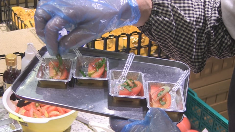 夏トマトの消費拡大を図るのが狙いで、来店客に夏秋トマトを試食してもらったり「夏トマトの日」がデザインされたうちわを配ったりしてアピールしました。