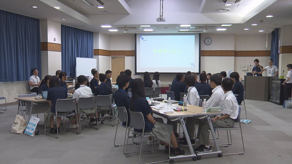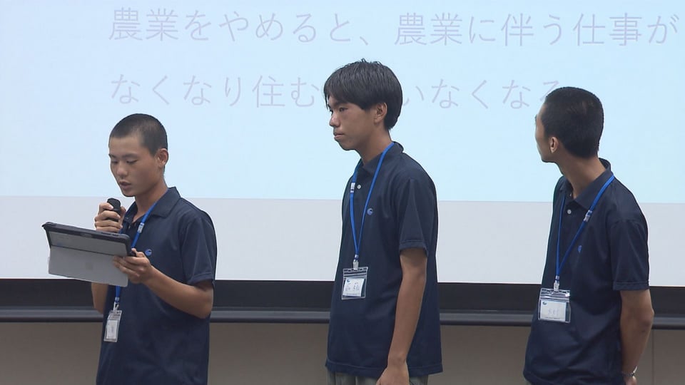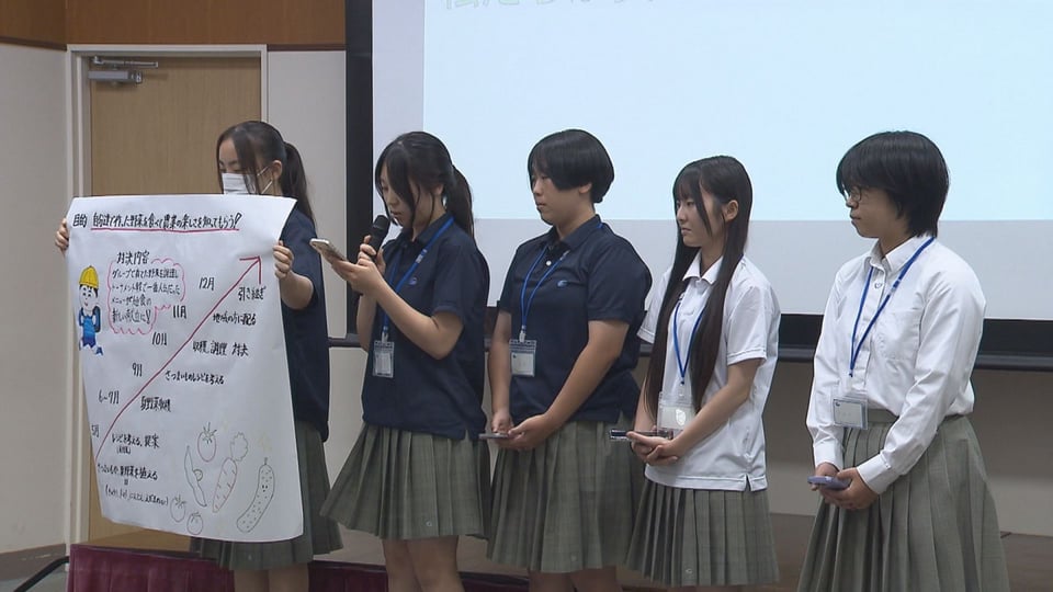 生徒たちは学校の「地域探求活動」で農業にスポットを当て、授業で学んだり体験したりした成果を江崎禎英知事と堀智考農政部長の前で発表しました。