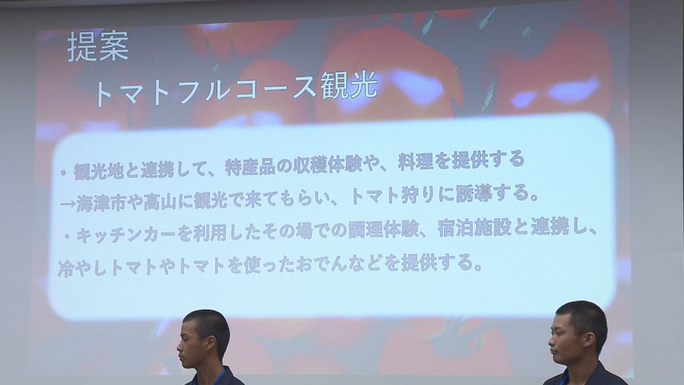 また、「農業と観光」というテーマで考えたグループは、規格外のトマトを活用した収穫・調理体験と観光地を巡るツアーを組み合わせて海外観光客を呼び込むトマトフルコース観光を提案しました。