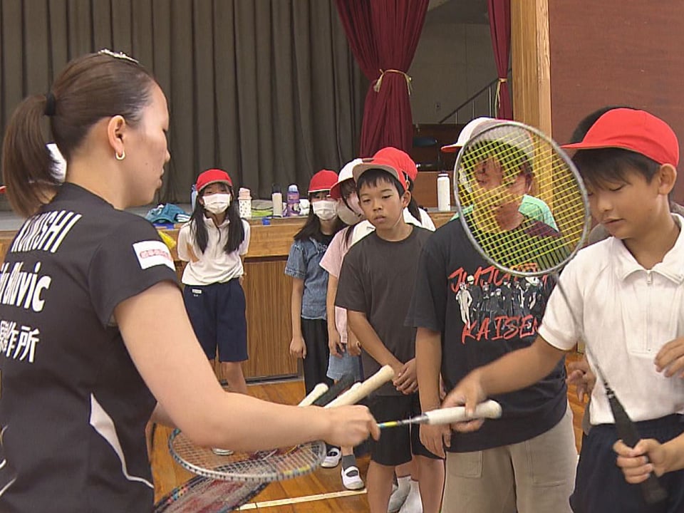 バドミントンのプロチーム・岐阜Bluvic(ブルビック)の選手が7日、岐阜市内の小学校を訪ね、体験談や実技を通じて夢の見つけ方、かなえ方などを児童に伝えました。