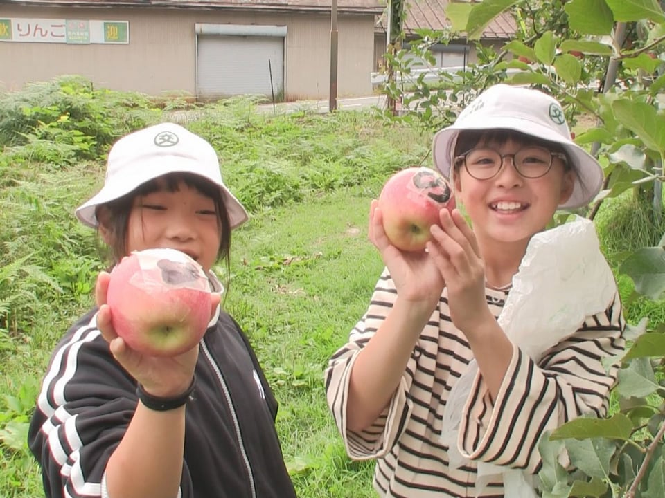 児童らは天木政彦組合長から収穫の仕方を習うと、文字や図形、サクランボやカボチャなど、さまざまなデザインのシールを貼った世界に一つだけのリンゴを丁寧に収穫していました。