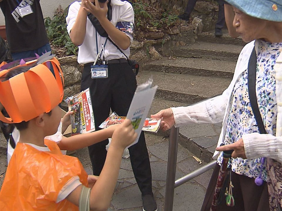 園児らは、観光客らに「気を付けてください」と声をかけながら、お菓子と啓発チラシを配りました。