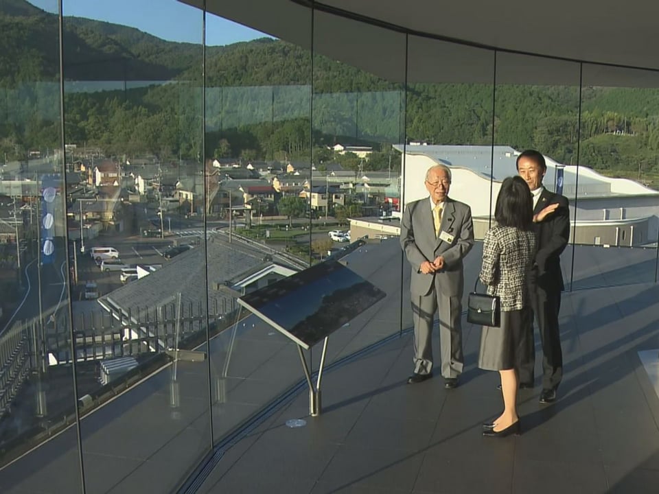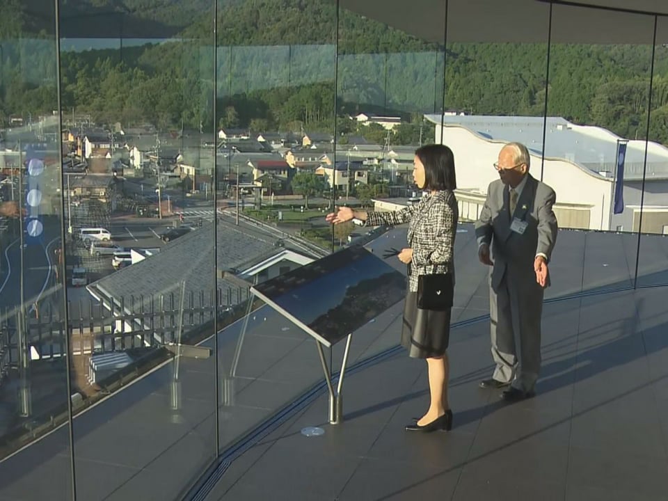 最上階の展望室からは関ケ原の古戦場が一望できます。小和田館長が西軍・東軍の布陣や戦いが起きたとされる場所などを解説し、彬子さまは「資料だけでは実感できませんが、ここからですと全てが見通せますね」と感想を述べられ、関ヶ原合戦で対峙した両軍の距離を感じておられました。