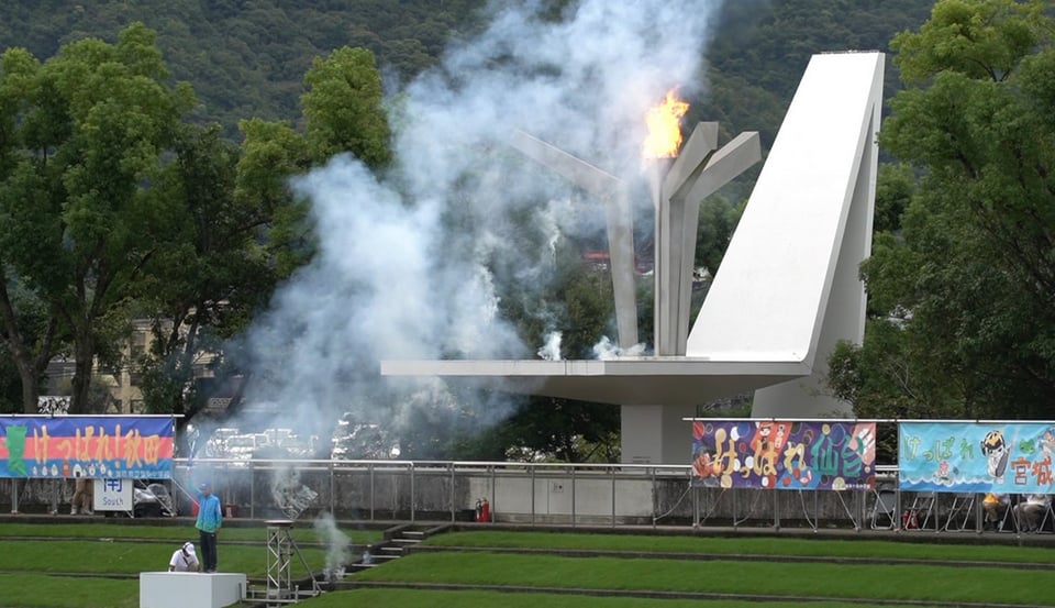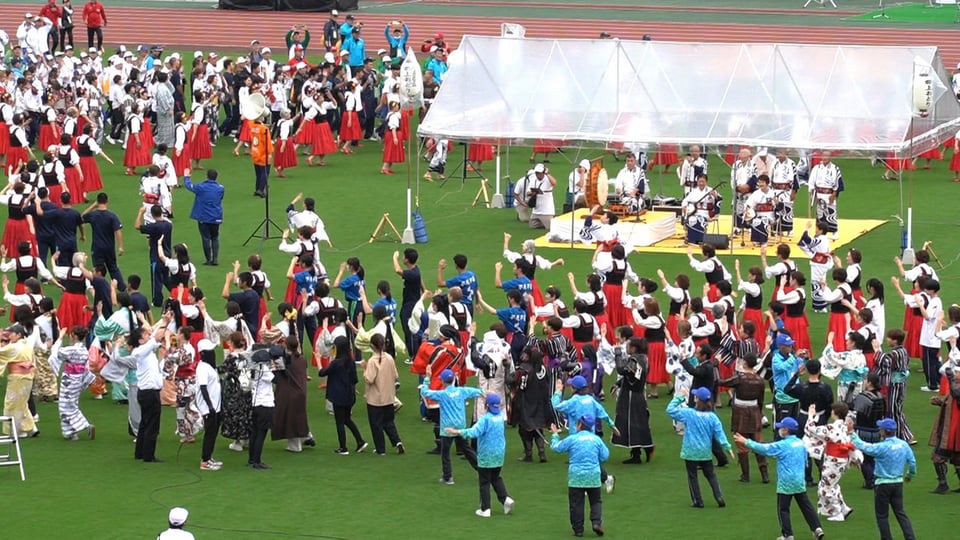会場では炬火の点火が行われ、4日間にわたる祭典が開幕。競技場では高校生による選手に向けた応援や郡上踊りなどのアトラクションが展開され、大会を盛り上げました。