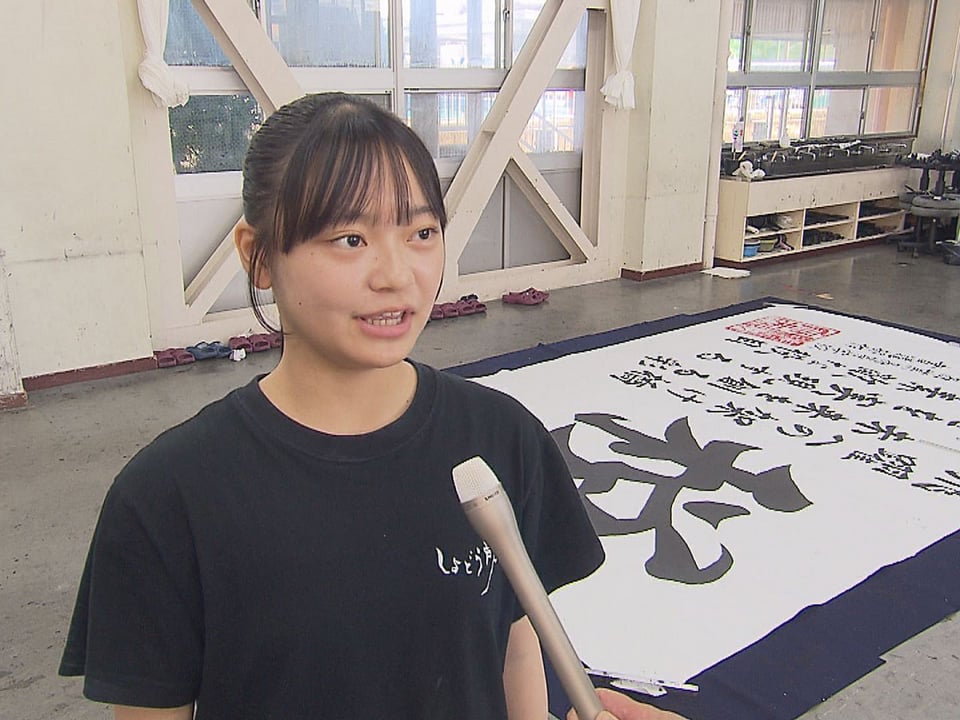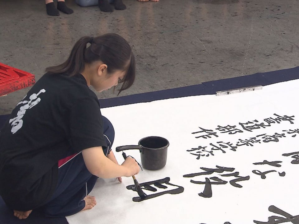 その一環で巨大な書作品を制作したのは、県立岐阜商業高校書道部の生徒で、縦2・4メートル、横4メートルの和紙2枚に、生徒たちが考えた「税」をイメージする言葉を一字一字丁寧に書き上げました。