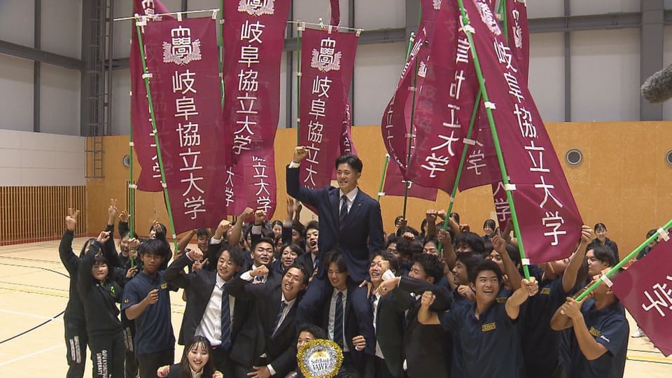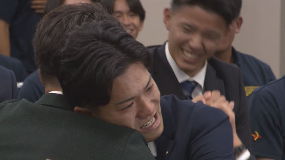 岐阜協立大学で指名を待った相良選手は、自分の名前が呼ばれた瞬間、部員と抱き合い喜びを爆発させました。