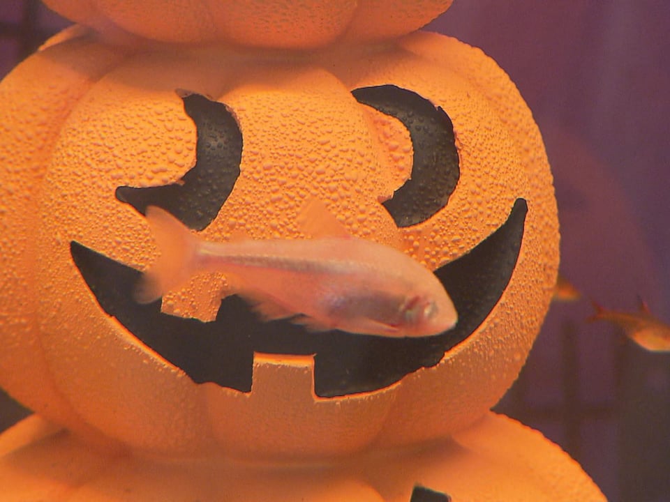 今回は「おさかなたちのハロウィンパーティー」と題し、カボチャやおばけの装飾の周りを約100匹が泳ぐにぎやかな水槽となっています。
