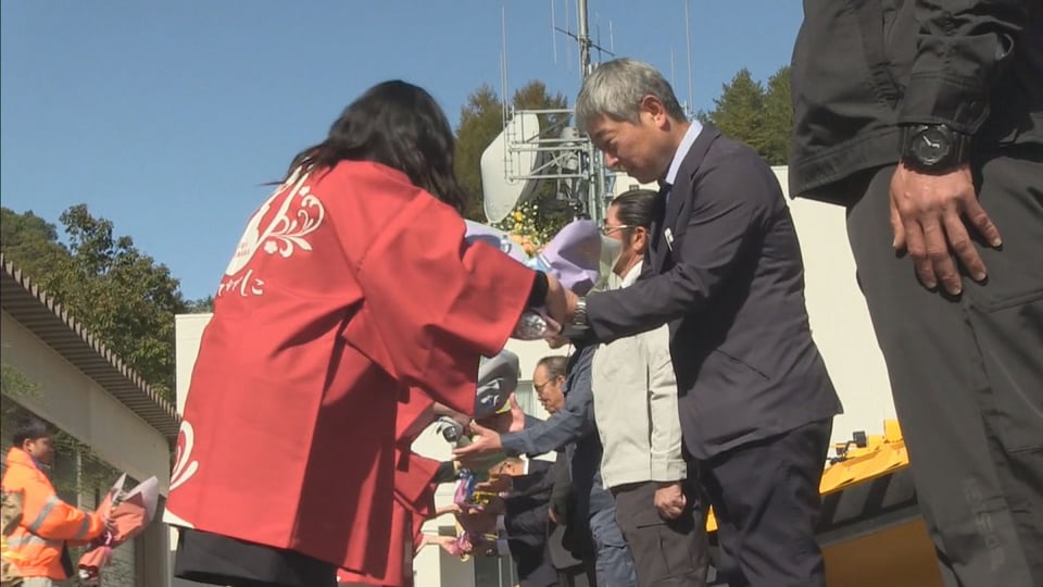 出陣式では、市内のホテルや旅館の女将らでつくる「飛騨高山おもてなでしこ」の5人が、除雪作業への感謝の気持ちを込めて花束贈呈を行いました。