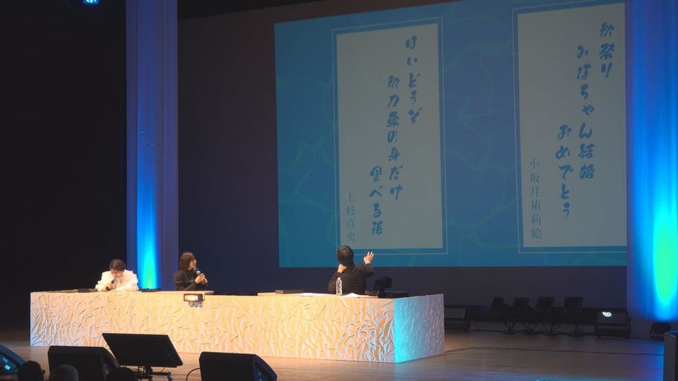 平坂さんらは岐阜県とのゆかりや思い出について話したり奥の細道むすびの地・大垣にちなんでオリジナルの俳句を詠んだりして会場を笑いに包んでいました。