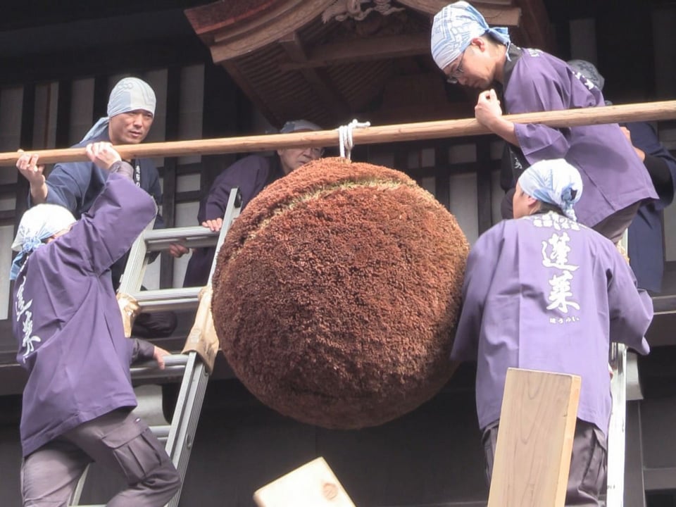 杉玉の掛け替えは造り酒屋の伝統行事で、蔵人が店先の古くなった杉玉を取り外し、直径約90センチ、重さ約100キロの緑色の真新しい杉玉を吊り下げました。