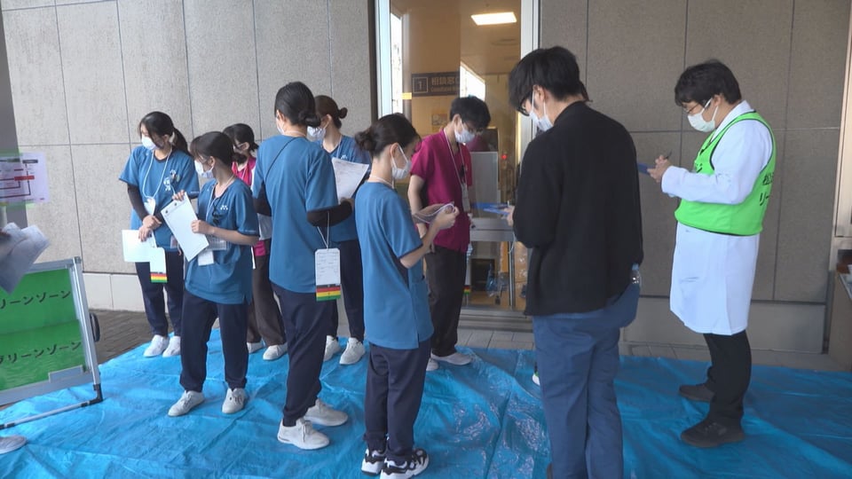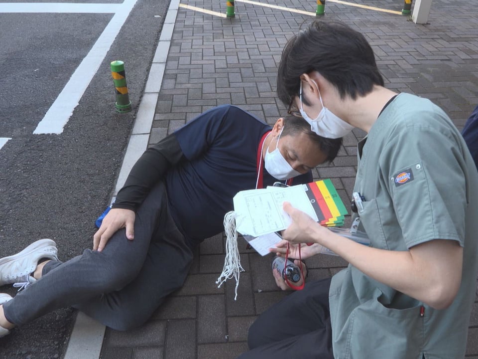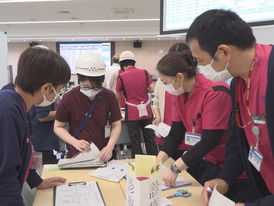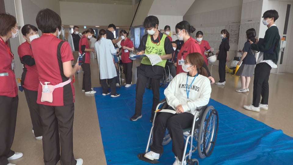 患者役が次々に搬送されると、病院の入口やロビー、救急部門の近くに設けたテントなどで、症状の重さによって治療の優先度を決めるトリアージが行われ、色分けされたエリアで医師らが素早く診察しました。