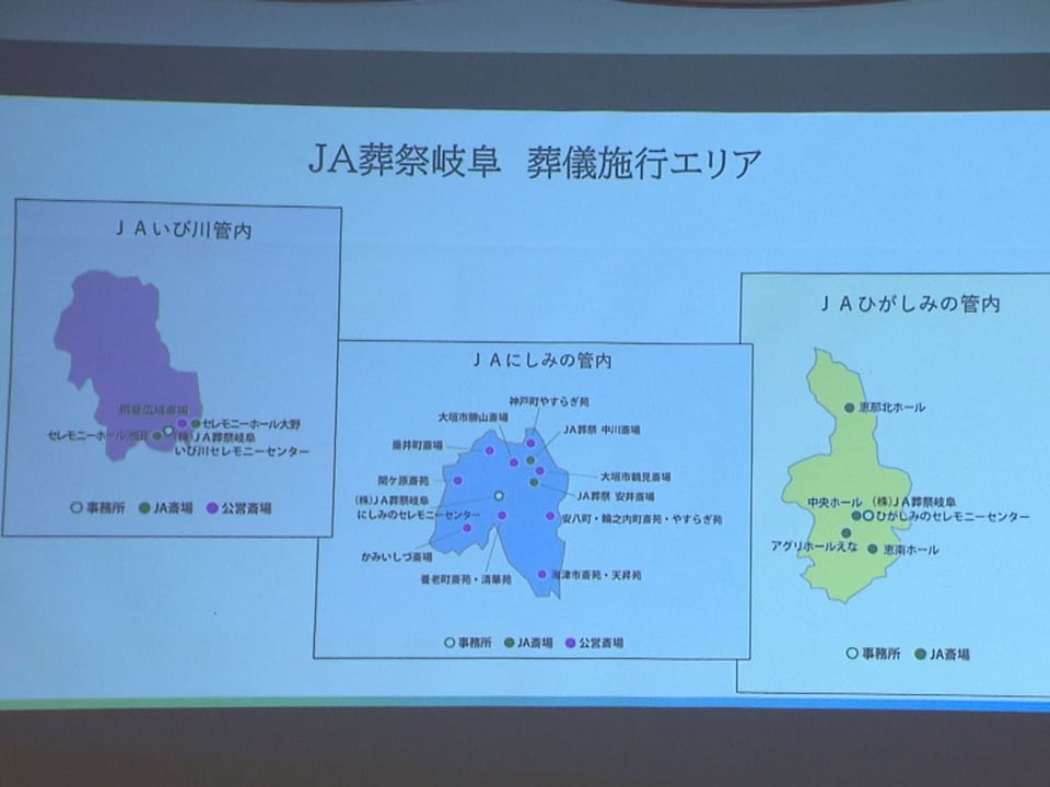 JA葬祭岐阜では、全農岐阜がこれまでも共同で葬儀事業を行ってきたJAにしみの、JAいび川、JAひがしみのと引き続き提携し、JAグループの葬儀場などで葬儀を行います。