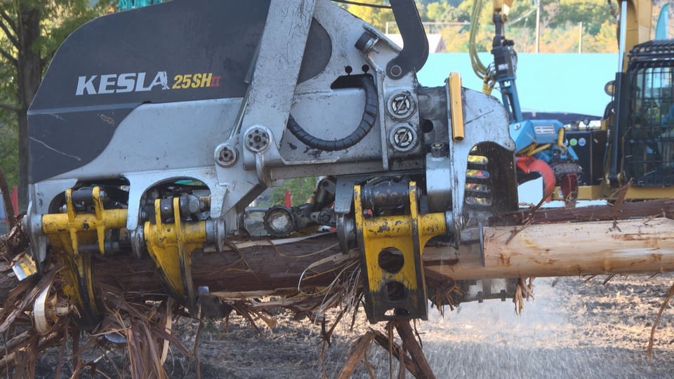 会場には、メーカーを中心に17社が出展し、振動を抑える機能がついたチェンソーや遠隔で操縦できるショベル、枝や幹の角度に合わせて伐採し運搬まで1台でできるトラックなど最新の林業機械が並びました。