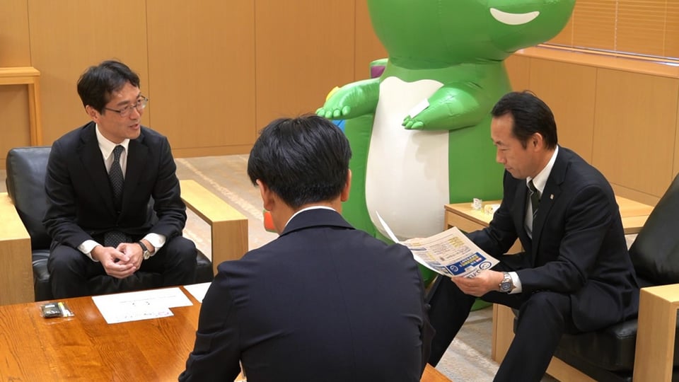 資産形成のためには、学びの機会、金融経済教育の取り組みが重要で、ワニーサは金融担当大臣から任命された「ワニー参事官(サんじかん)」の名刺を江崎知事に渡して、金融経済教育の充実に向けた連携の強化を求めました。