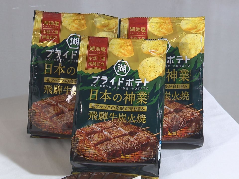 式典では、中部工場の開業を記念して開発された商品「プライドポテト 日本の神業 飛騨牛炭火焼」が発表されました。この商品の製作には岐阜県の江崎禎英知事も関わり、パッケージのデザインや味付けについてアドバイスしたということです。