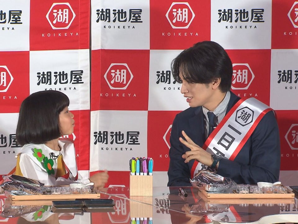 そして、CMキャラクターを務める中島健人さんと永尾柚乃さんが登場。1日工場長に任命された2人にお菓子で出来たブーケが渡されました。