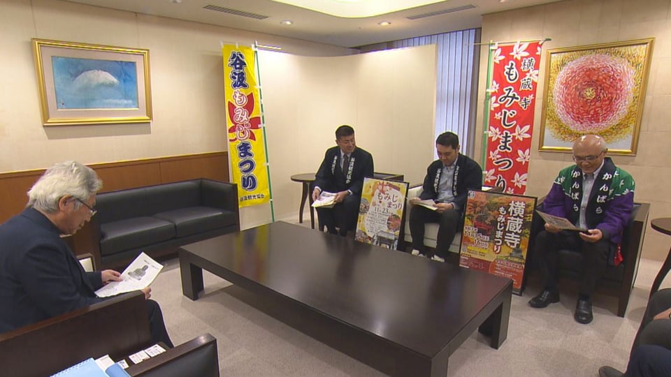 揖斐郡揖斐川町谷汲地区で11月に開かれる2つのもみじまつりの実行委員会のメンバーらによるPRキャラバンが岐阜放送本社を訪れ、来場を呼びかけました。