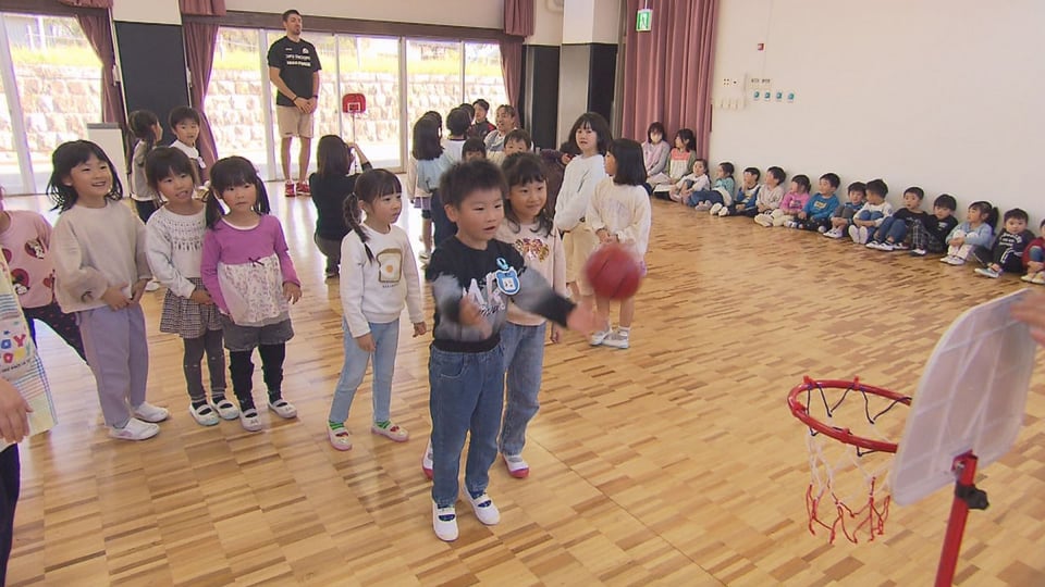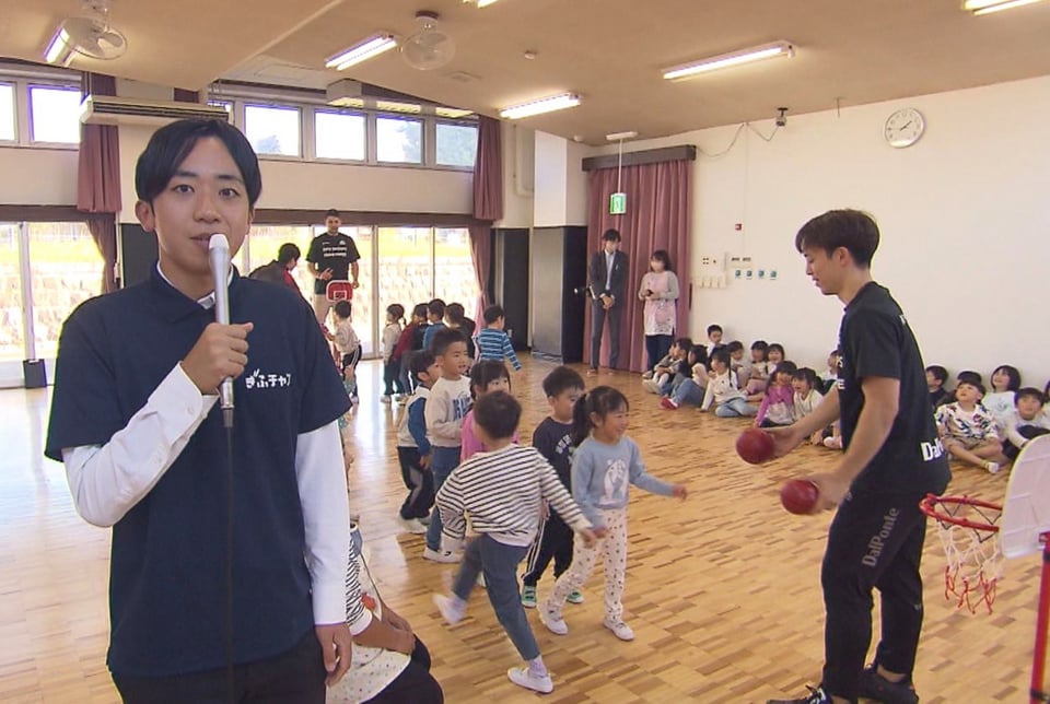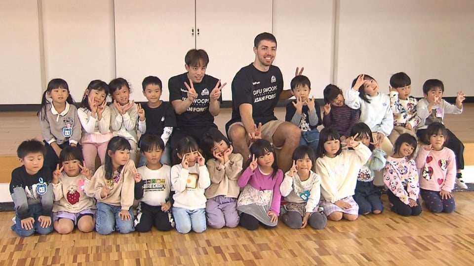 バスケットボールB3リーグの岐阜スゥープスの選手らが6日、岐阜県羽島郡笠松町の園児らと交流し、ホーム戦への来場をPRしました。