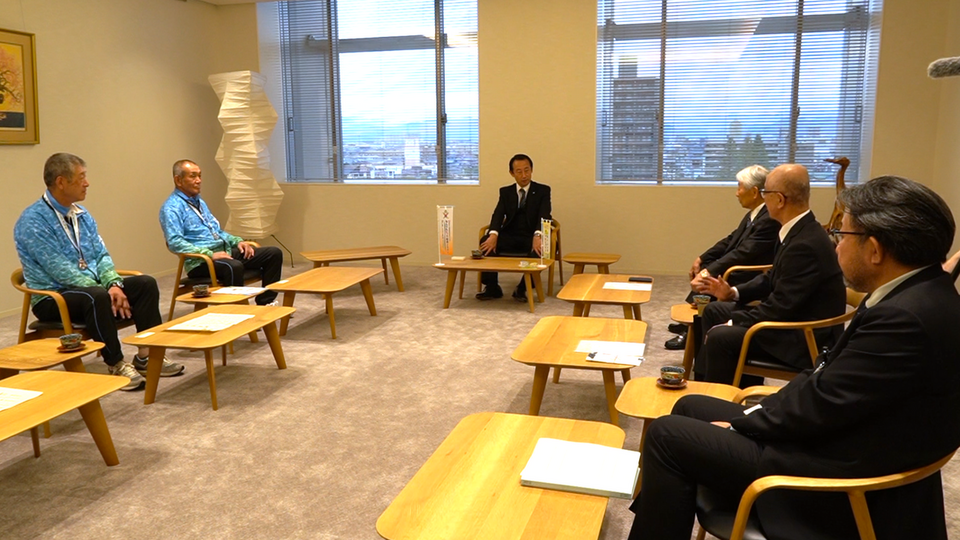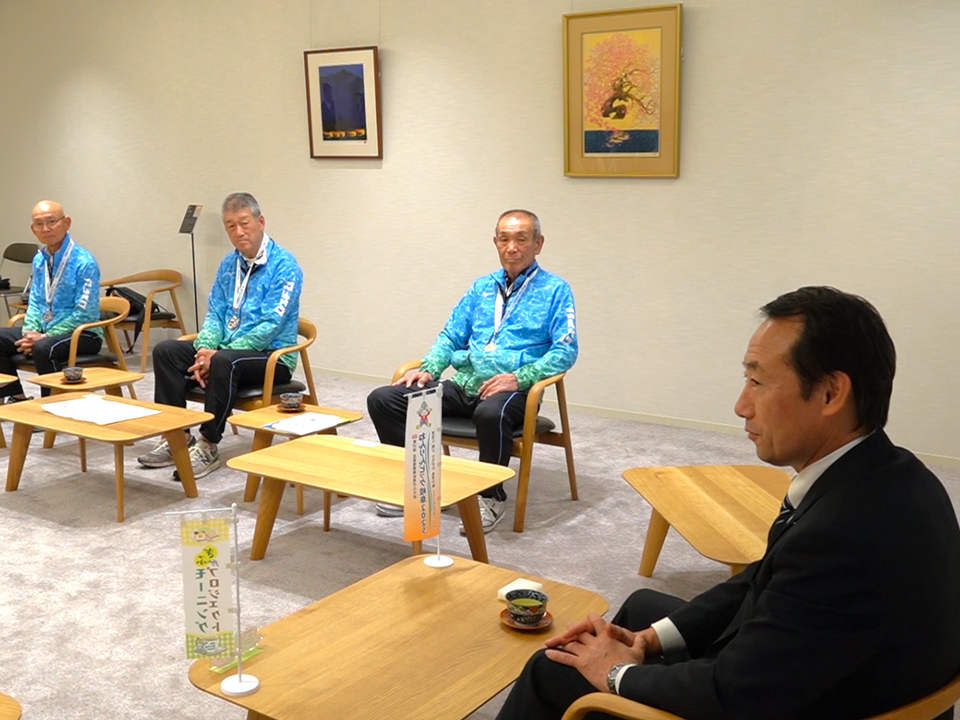 県庁で江禎英知事と面談したAチーム監督の後藤誠さん(78)は「地元開催で優勝でき、喜んでいる。プレッシャーもあったが、結果が出せて良かった」と話しました。