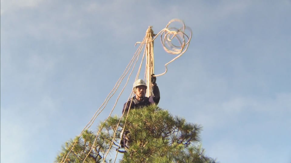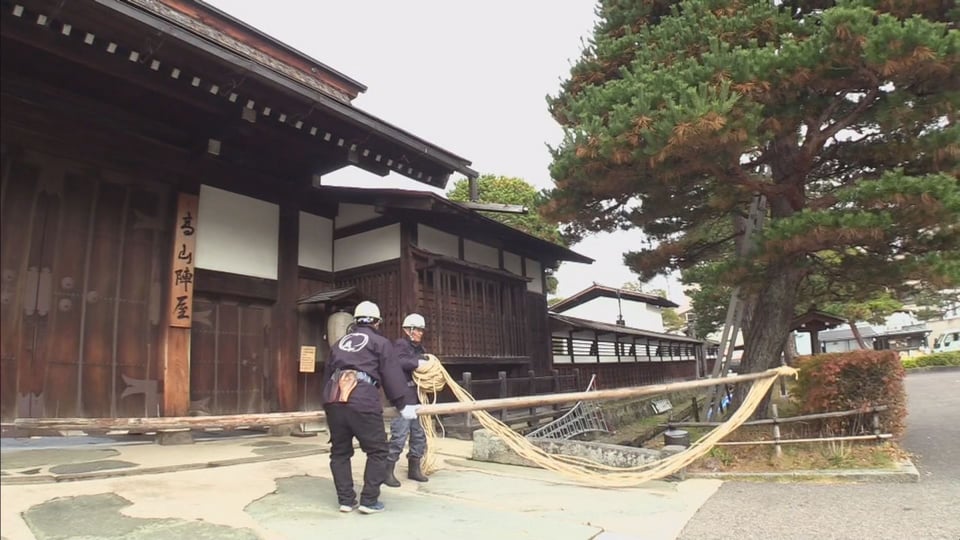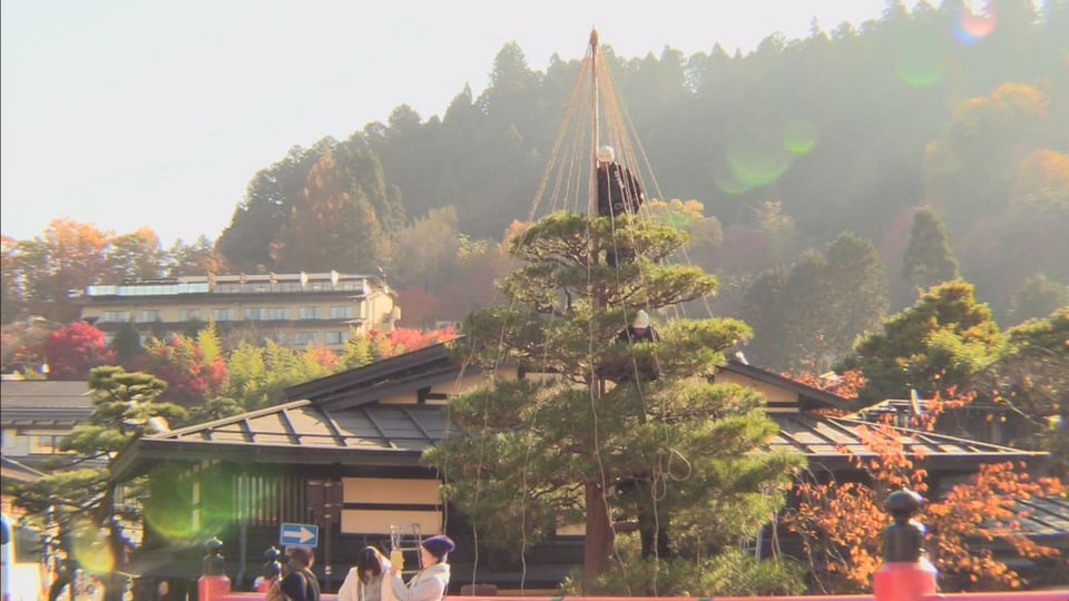 観光スポットの高山陣屋や、赤い中橋周辺では、地元の造園業者が木の高さや枝ぶりに合わせ20本から30本の縄を付けた支柱を幹に縛り付けると、縄を円錐状に垂らし、枝が痛まないように、張り具合を調整しながら結びつけていきました。