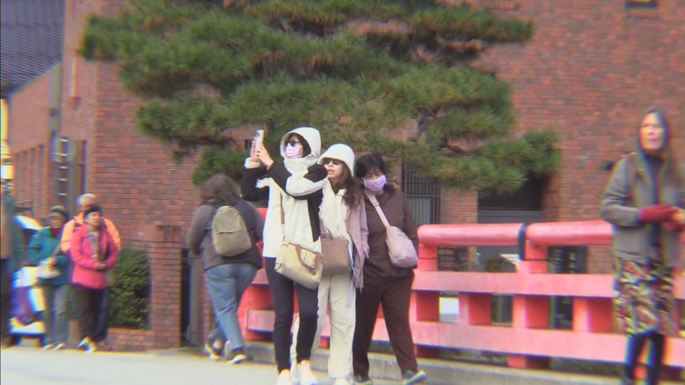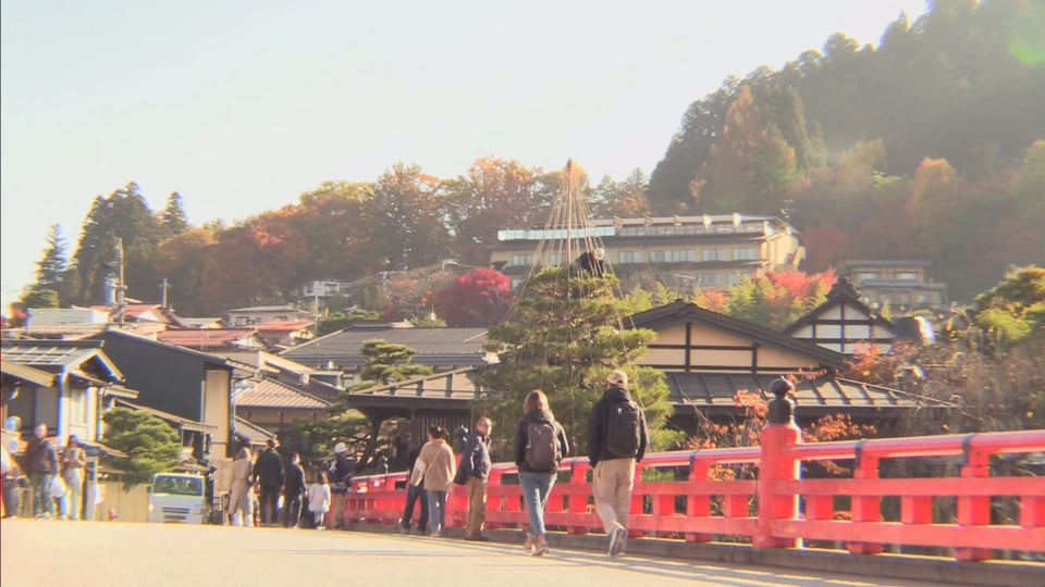 通りかかった観光客らは足を止め、飛騨地方の晩秋の光景に見入っていました。