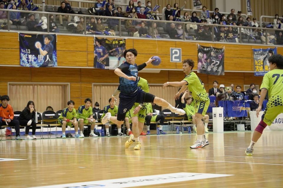 ハンドボールリーグH男子の公式戦が22日、多治見市大畑町の感謝と挑戦のTYK体育館(多治見市総合体育館)で豊田合成ブルーファルコン名古屋のホームゲームとして行われ、市民らが選手の活躍に声援を送りました。