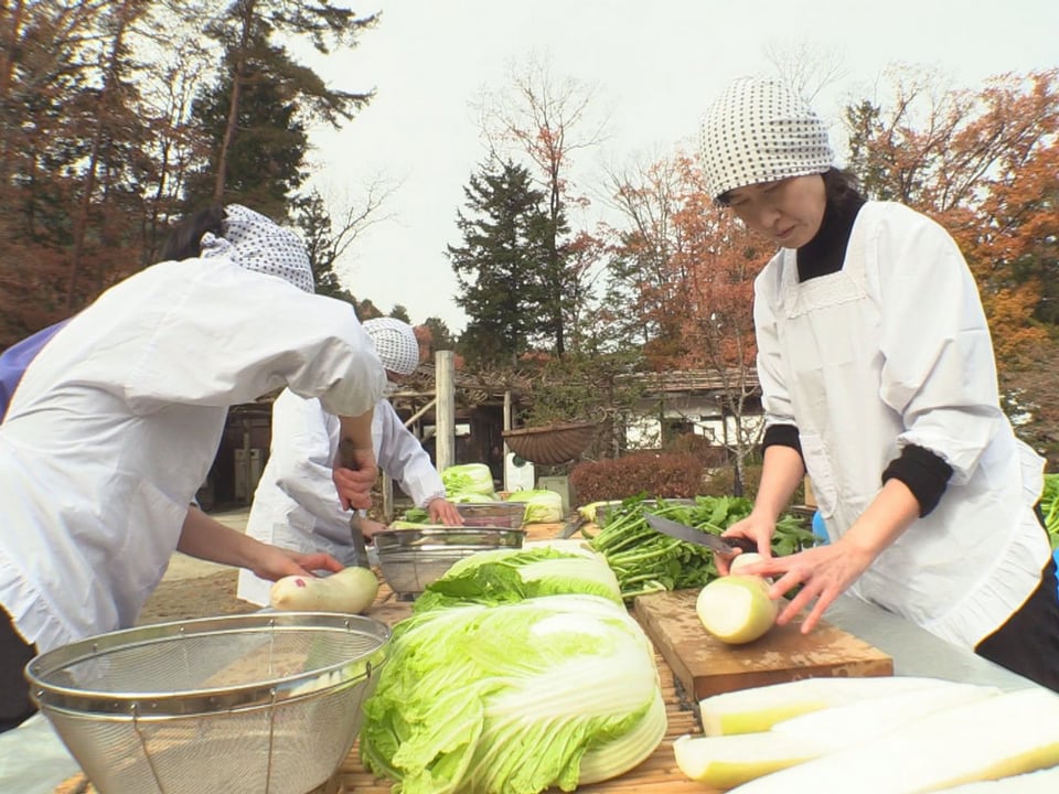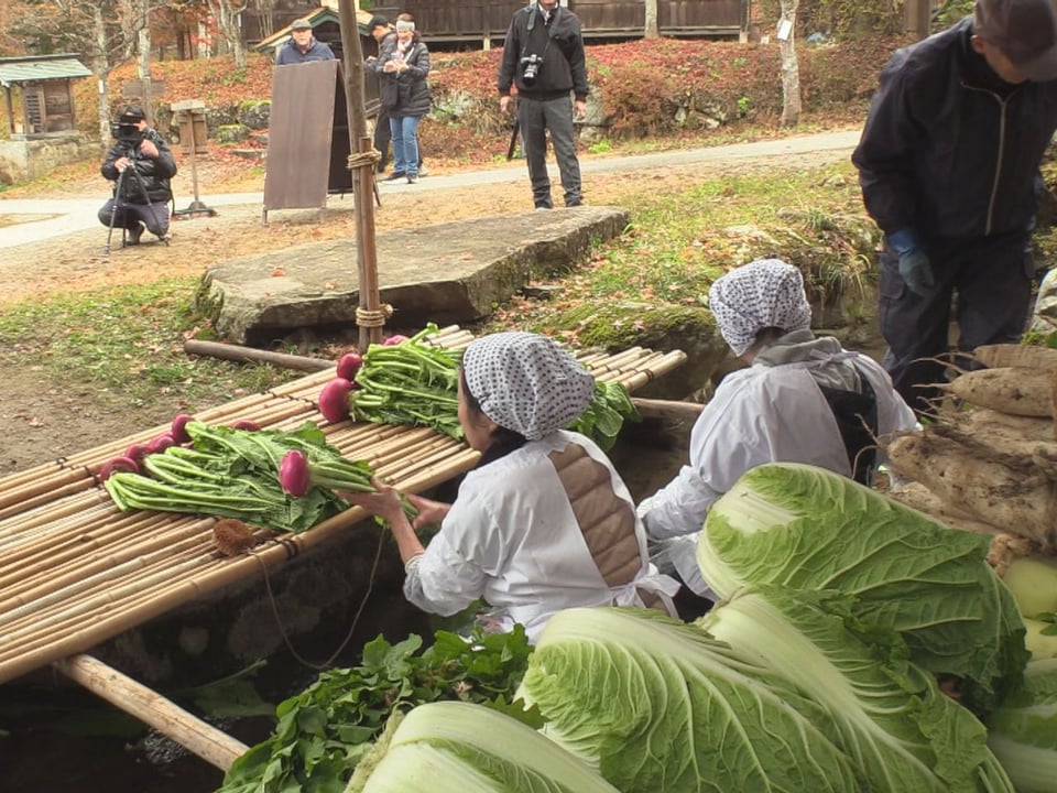 飛騨地方の長い冬に備える漬物づくり「菜洗い」の実演が高山市の「飛騨の里」で行われました。