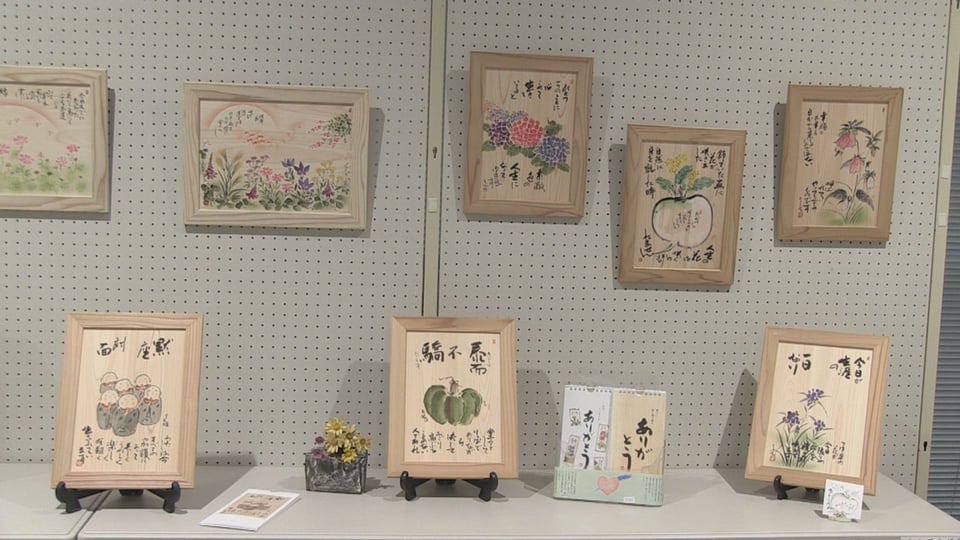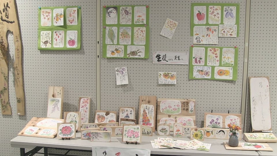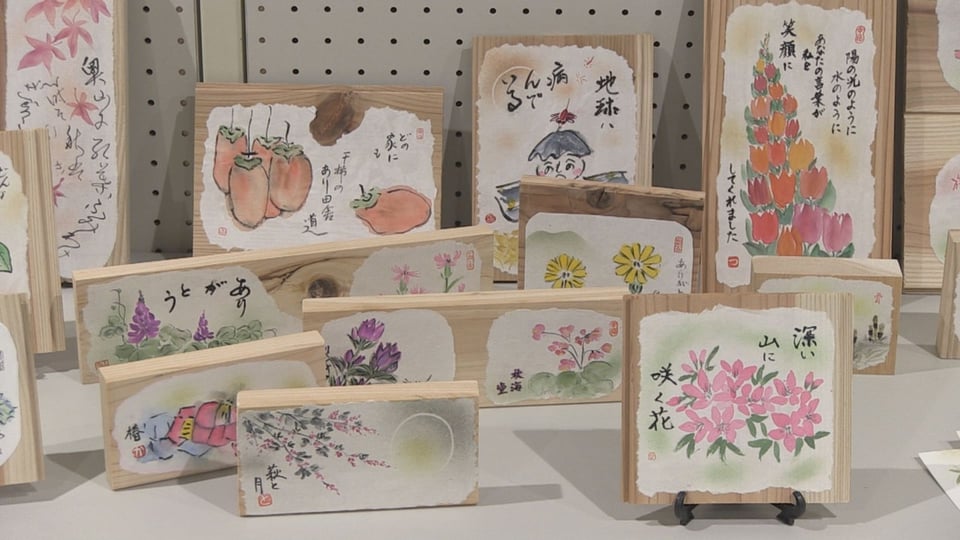 会場の各務原市産業文化センターには、加藤さんや生徒約90人が住宅建材の端材などの木材に顔料で描いた風景や草花などの絵と加藤さんがつくった詩を合わせた作品や、加藤さんと生徒が交わした絵手紙など約200点が展示されています。