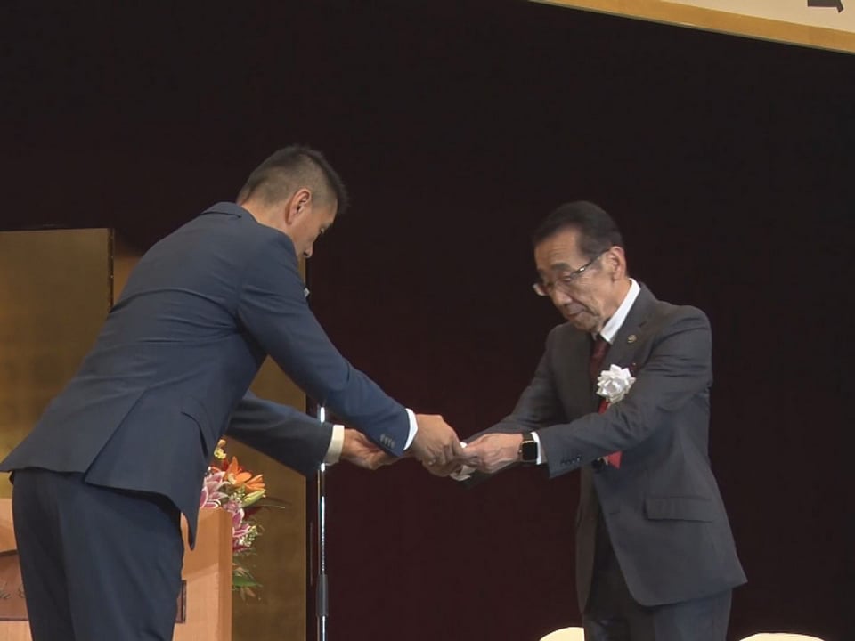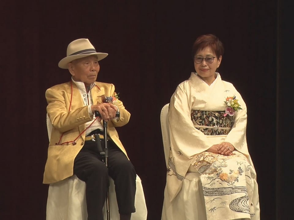 式典は馥名誉会長、るみ代表理事夫妻の結婚55周年の祝賀を兼ねて開かれ、約190人が出席。会の発起人代表の松井聡羽島市長らのあいさつに続き、孫らが花束を贈り、節目を祝った。