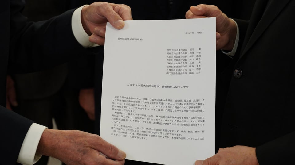 要望の内容は、岐阜市の北西部地域には岐阜大学や大学附属病院など教育・医療の重要な拠点があり、東海環状自動車道の岐阜IC(インターチェンジ)も開通し活性化が期待されるとして、地域のさらなる発展のためにLRT整備構想の実現を求めています。