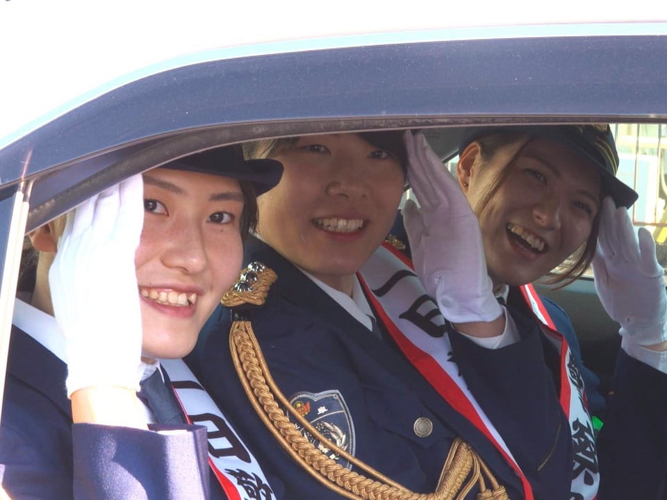 その後の出発式で3人の選手が見守る中、署員らはパトカーや白バイに乗り込み、街頭啓発に繰り出しました。
