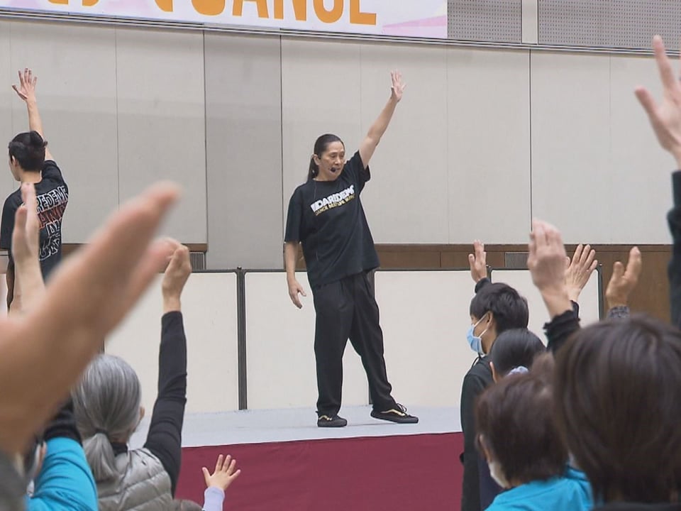 市民らはTRFの楽曲に合わせて、ステップを踏みながらリズミカルに腕や膝を曲げ伸ばし、健康づくりにつながるダンスに汗を流しました。