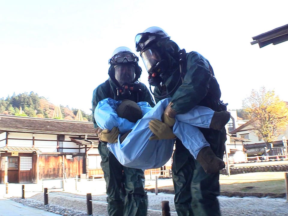 駆けつけた消防隊員が防護服を着用して要救助者の対応を行い、汚染の恐れがある衣服の処理についても手順を確認しました。