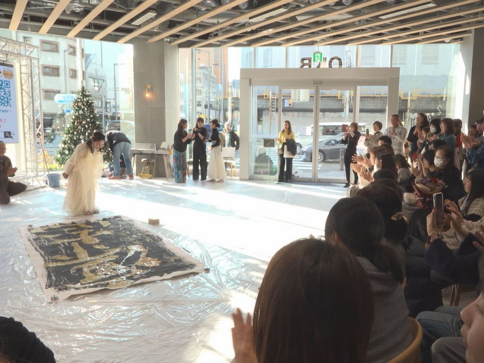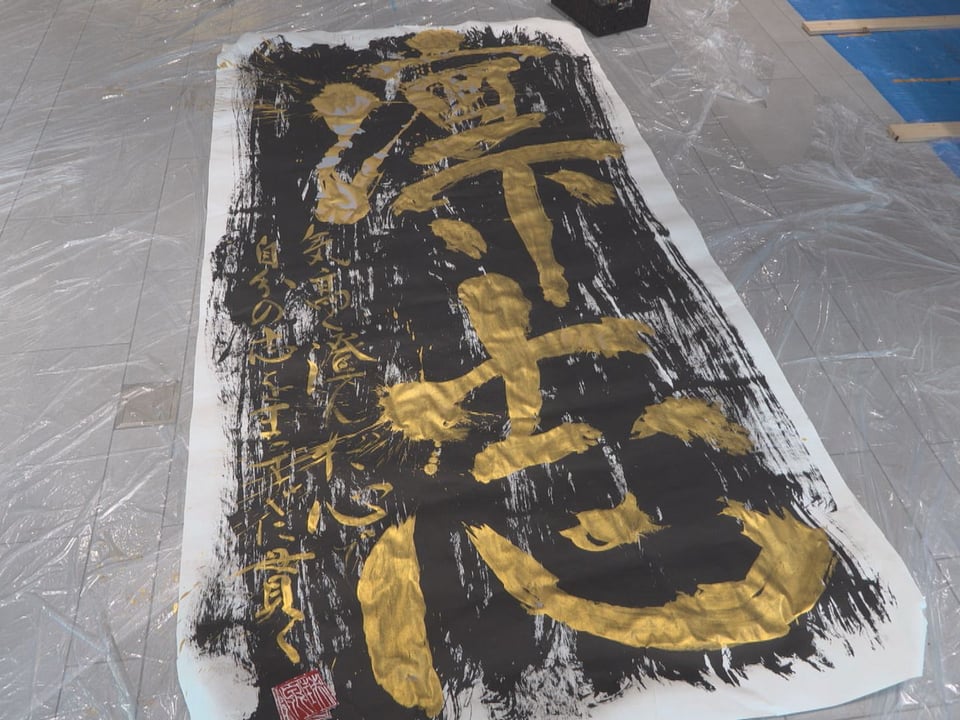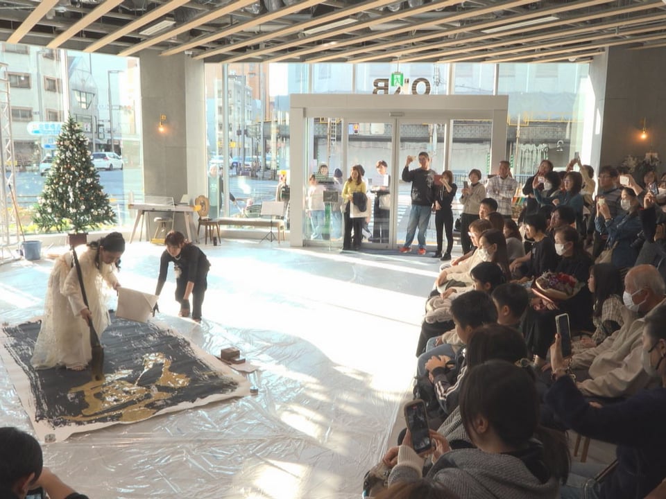 主催した河口さんのパフォーマンスでは黒い墨が塗られた縦3メートル、横1・5メートルの紙に金色の顔料を使って「凜志」と力強く書き上げると、 固唾をのんで見守っていた約100人の観客から拍手が送られていました。
