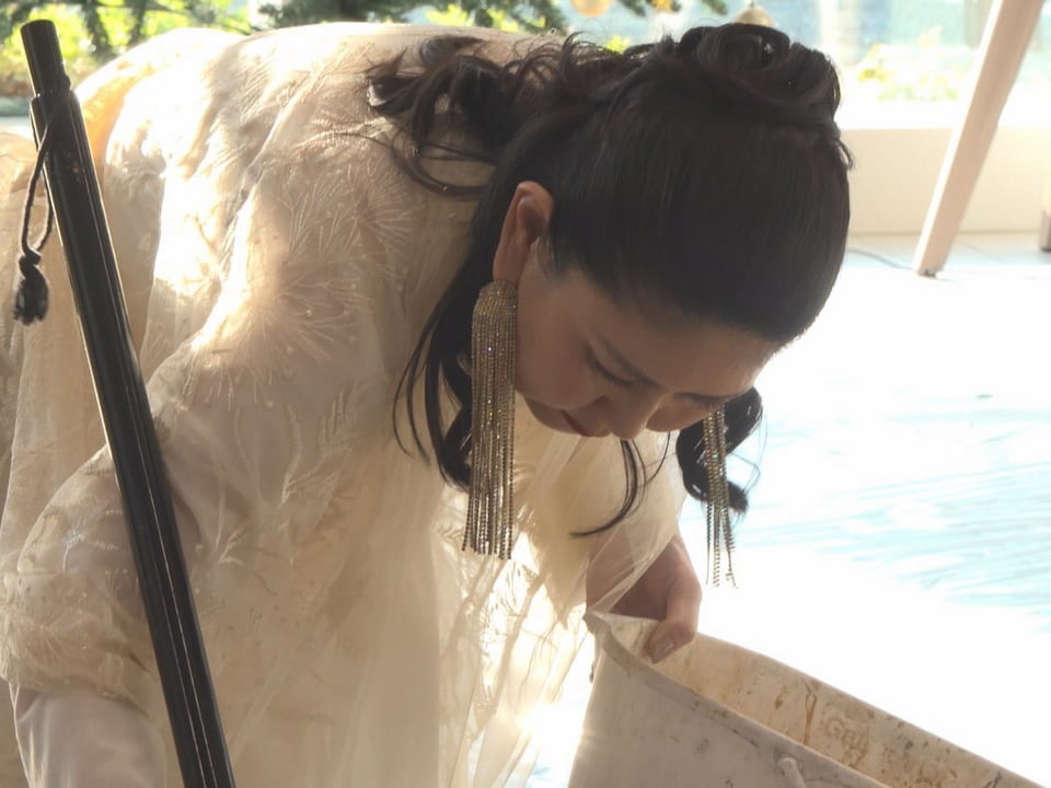 書道パフォーマンスを行ったのは河口さんのほか、佐藤薫瑩さん、小泉麗芳さん、高橋彩花さん、竹腰桃苑さん、西村碧泉さんで、「六華 筆が咲かせる慈しみ」と題して華やかでダイナミックな筆を披露しました。