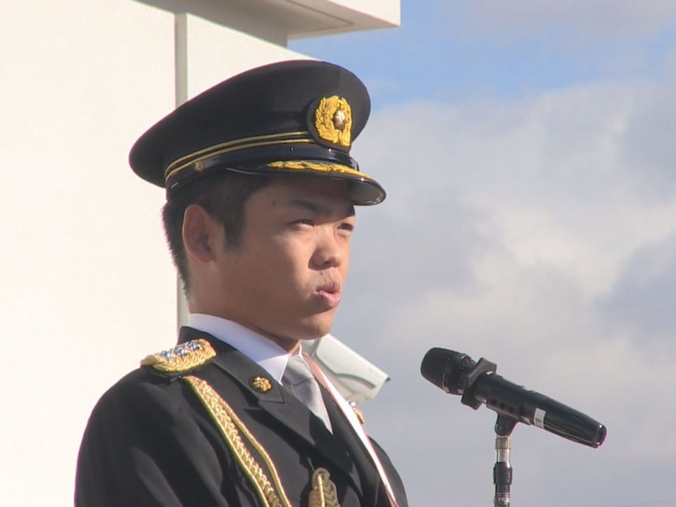 根尾投手は高山警察署の洞口幸男署長から一日署長の委嘱状を受け取ると、パトロールの出発式に臨み、警察官らを前に訓示しました。