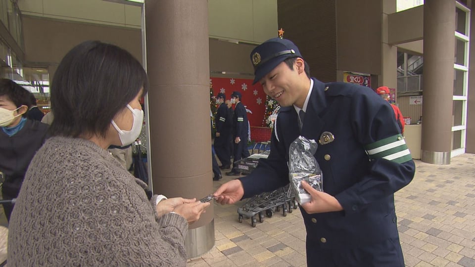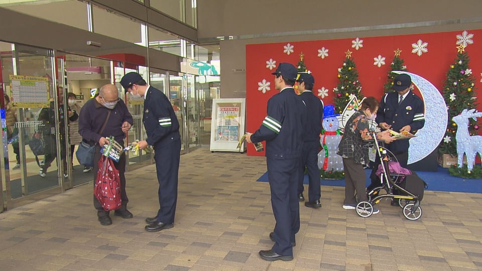 年末の交通安全県民運動が11日、始まりました。岐阜県内各地でさまざまな取り組みが行われ、岐阜市などのショッピングセンターでは、県警察学校の初任科生が買い物客らにチラシなどを配って交通安全を呼びかけました。