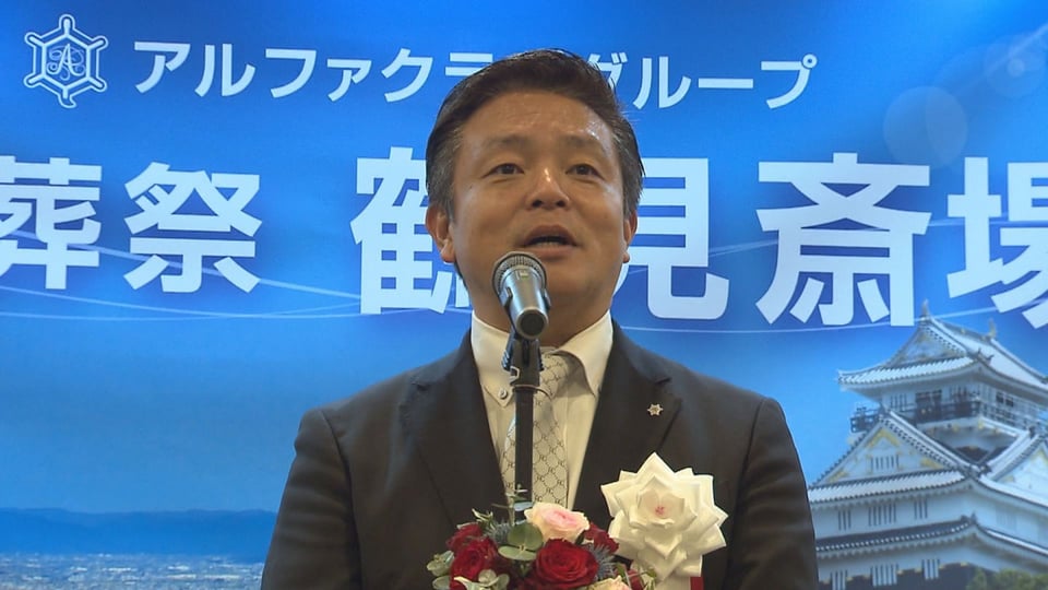 「この鶴見斎場のこの場所は、岐阜葬祭時代の岐阜市において一番最初にできた葬祭会館でございます。きょうこのように生まれ変わって皆さんにお披露目することができました。ほんとに我々アルファクラブとしましてはうれしいことで今日このようなお披露目会を開催させていただいております」