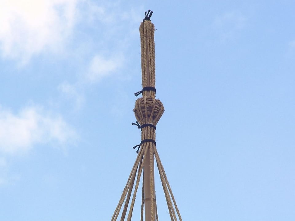 12日は、管理事務所職員が庭園の黒松約30本の木の高さや枝ぶりに合わせて幹に縛った支柱に12本から16本の荒縄を付けると、縄を巻いて王冠を象った部分から円錐状に垂らして、枝が痛まないように張り具合を調整しながら結びつけていきました。