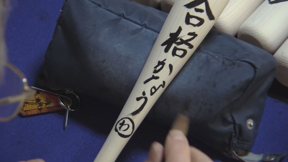 「合格」や「夢」、「幸せ」などの文字が入ったバットが並べられ、「合格かなうわ」と一文字ずつ思いを込めて書き入れていました。