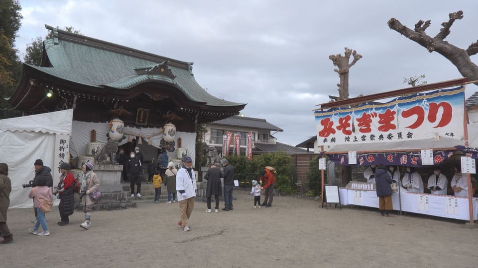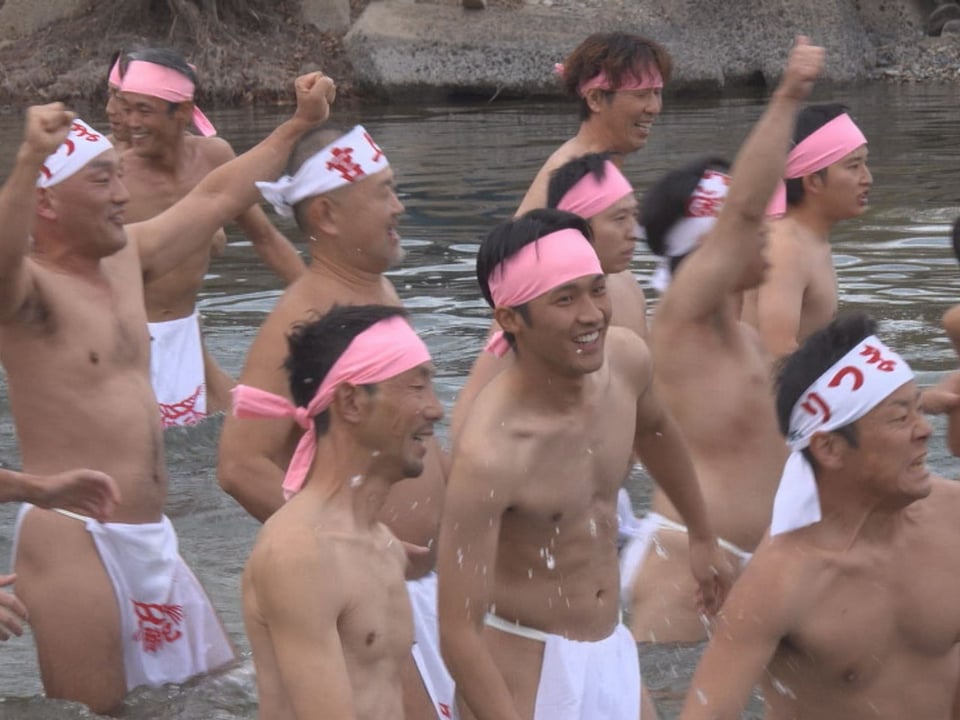 岐阜市の葛懸神社の伝統的な神事「みそぎ祭」が行われ、寒空の下、ふんどし姿の裸男らが13日、家内安全や地域繁栄を願って長良川の清流で身を清めました。