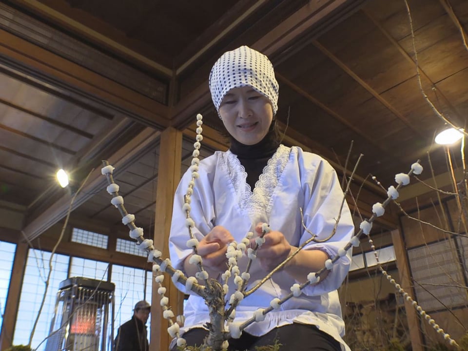 また、短冊状に切った白い餅を蚕の繭玉のように木の枝に巻く花もちづくりには、来館者も参加しました。