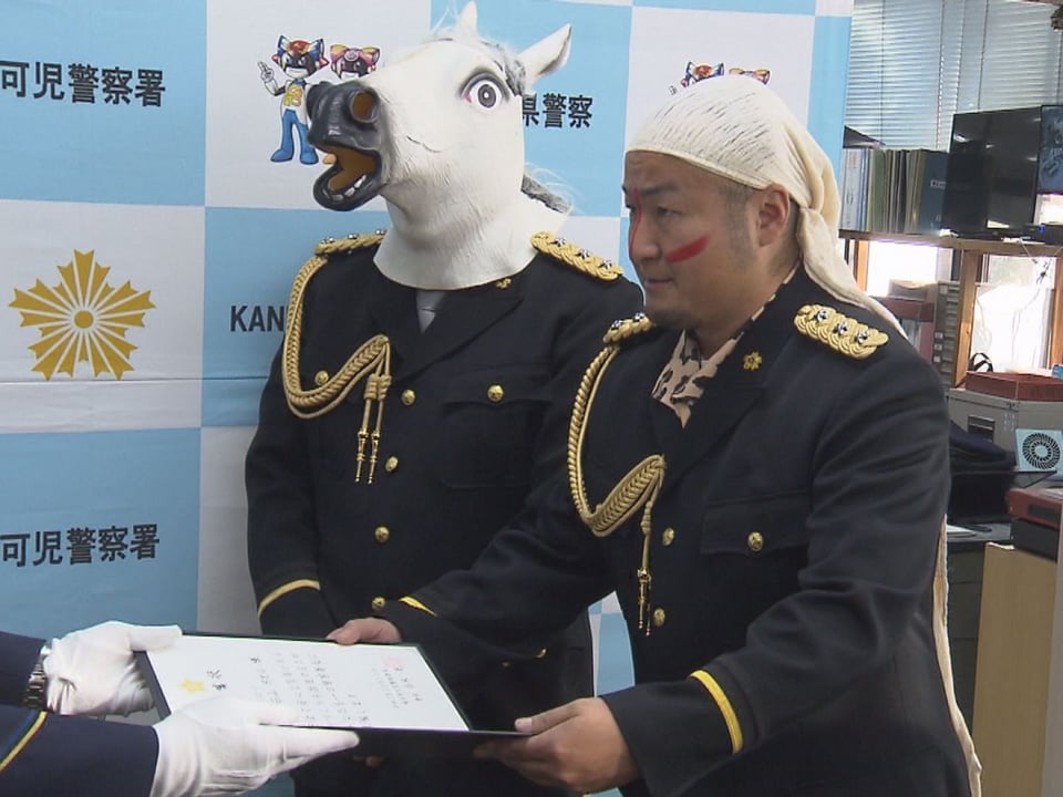 1日署長に委嘱されたのは、「ダンソン」「ニーブラ」のリズムネタでおなじみのお笑いコンビ「バンビーノ」の藤田ユウキさんと石山タオルさんの2人で委嘱式で、高木晃署長から委嘱状を受け取りました。