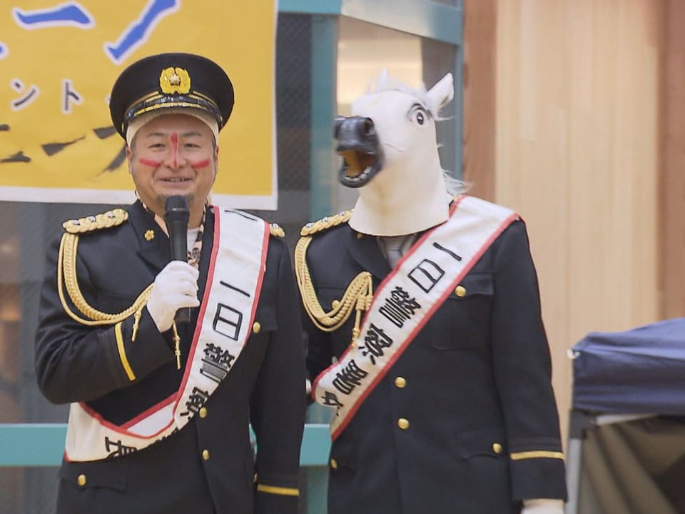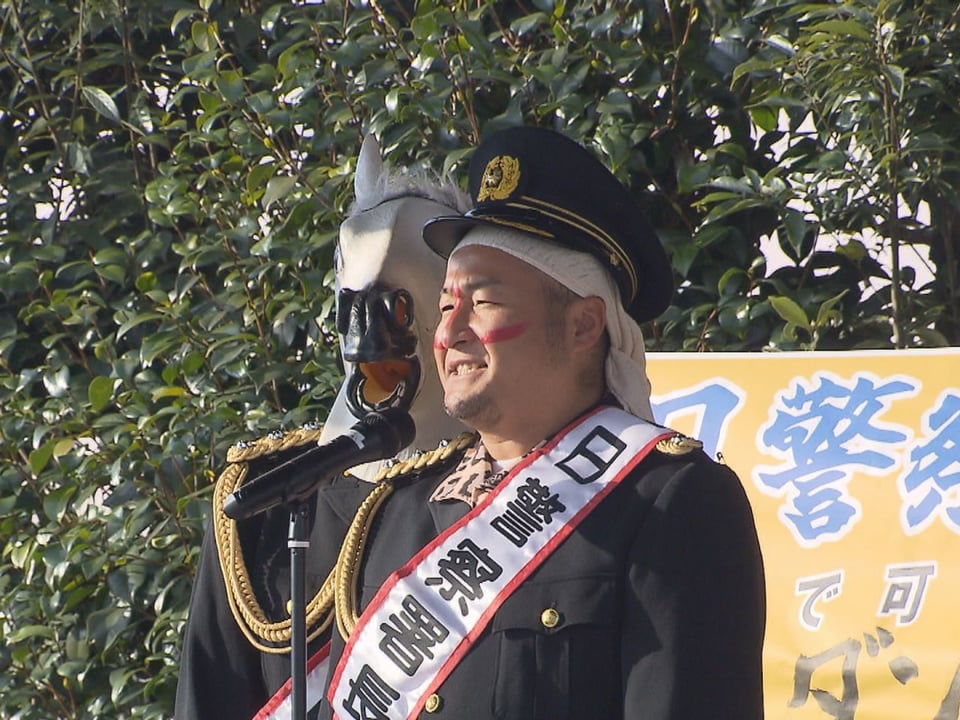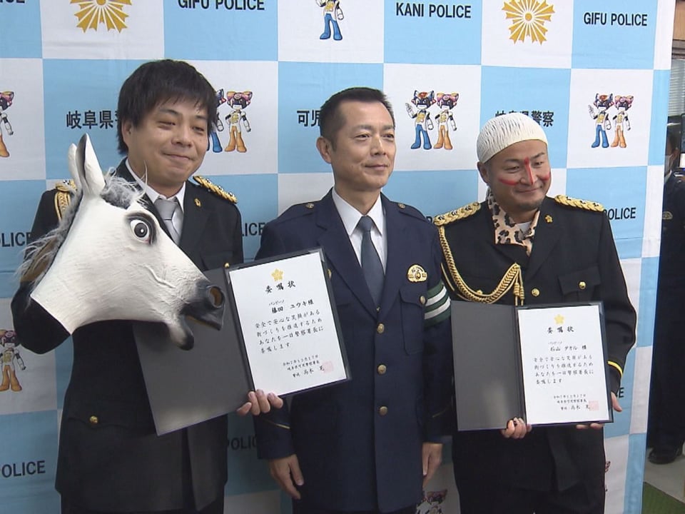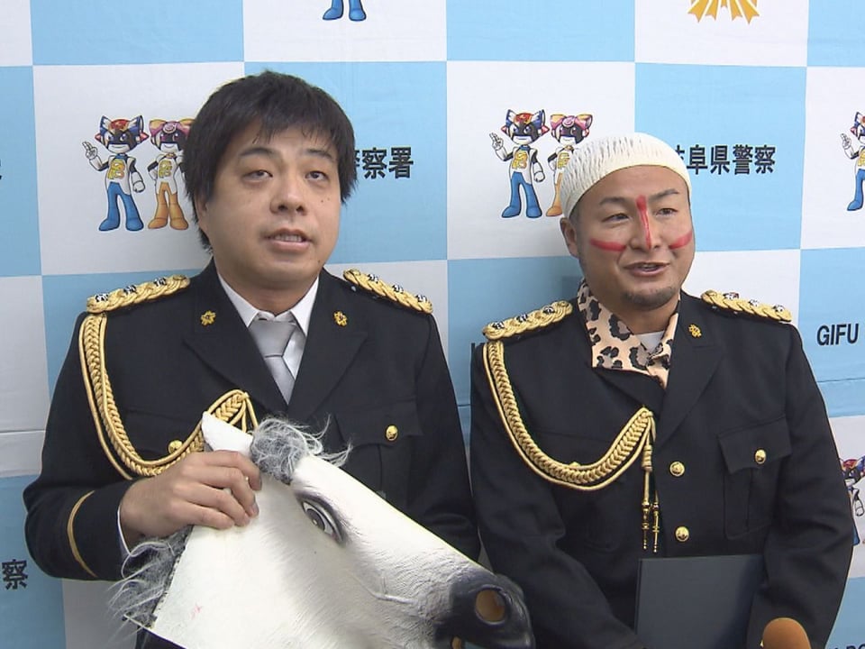年末年始の地域安全運動と年末の交通安全県民運動に合わせ、お笑いコンビ「バンビーノ」の2人が17日、可児警察署の1日警察署長を務め、お決まりのあのネタを交えながら犯罪被害の防止や交通安全を訴えました。