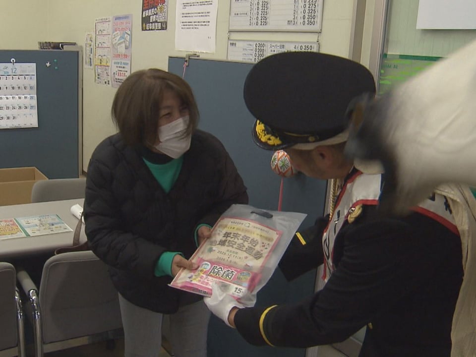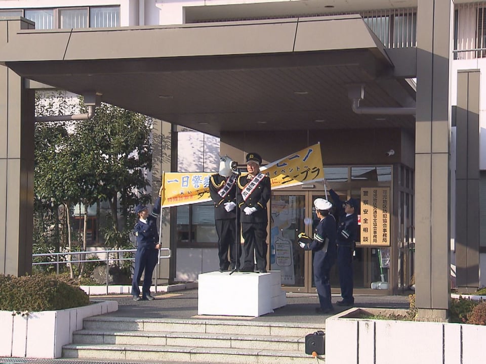 街頭啓発に繰り出すパトカーや白バイを見送った2人はその後、市内の金融機関で詐欺被害防止を呼びかけながら啓発チラシを配布。